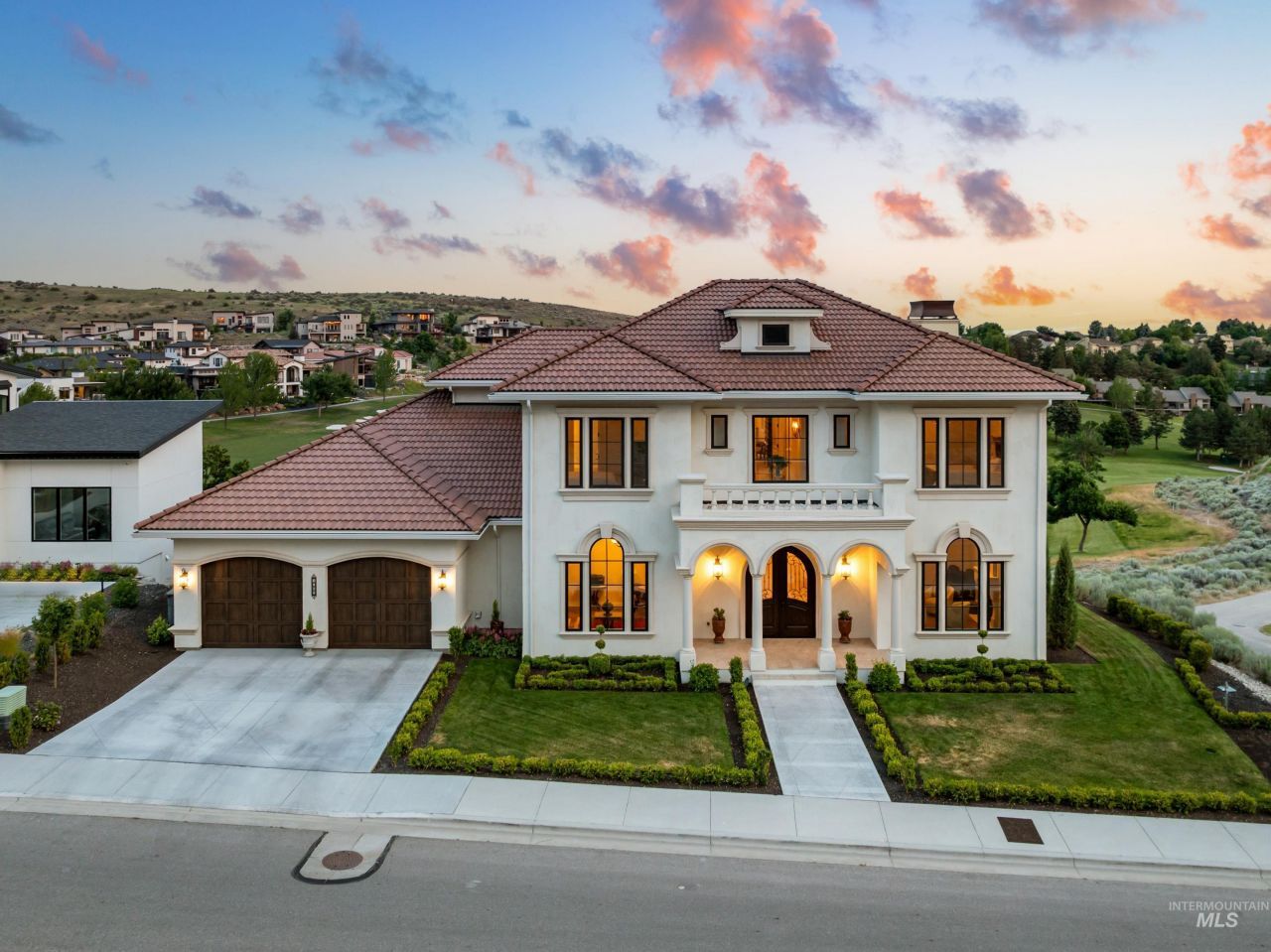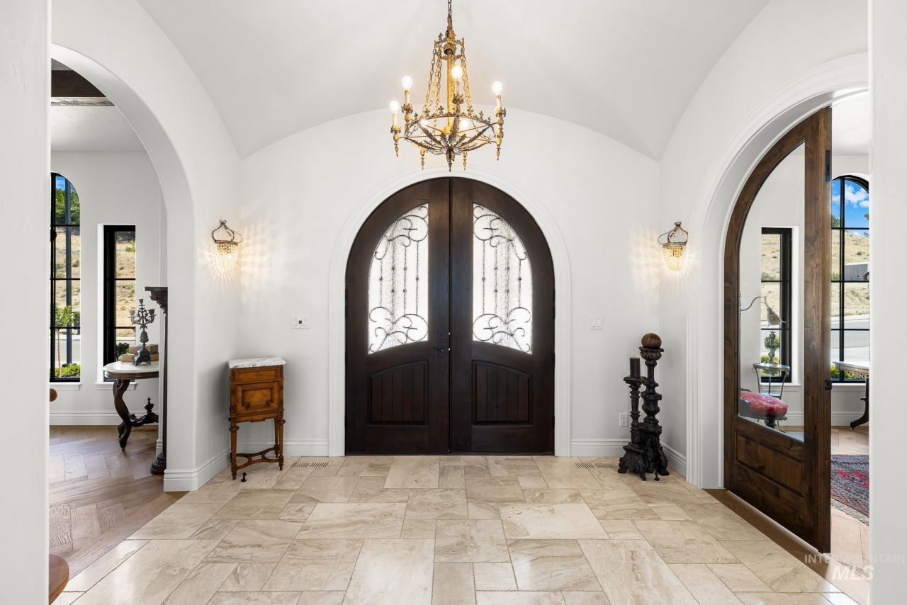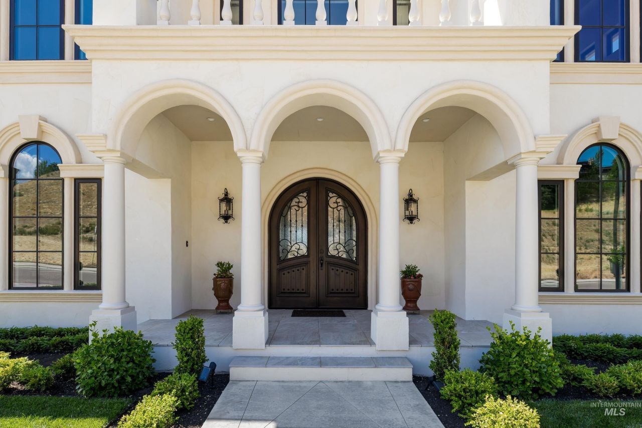 Framed by the rolling contours of the Boise Foothills and inspired by the terraced villas of the Mediterranean, this hillside estate sits poised above the 4th fairway of Crane Creek Golf Course. Designed in collaboration with Glancey Rockwell, the residence blends classical architecture with modern refinement. A triple-column portico anchors the entry, while sweeping archways and hand-forged ironwork orchestrate dramatic sightlines throughout. Herringbone oak floors flow beneath exposed ceiling beams, as gallery-like spaces celebrate light and form. Barrel-vaulted ceilings, custom walnut cabinetry, and cement-cast fireplaces reflect old-world inspired artisan craftsmanship. A calm, neutral palette and considered finishes- honed marble tile, hand-blown pendants, and bronze fixtures guide the eye from room to room. The upper-level sleeping quarters culminate in a serene primary suite opening to a private, radiant patio with unobstructed foothill views. Beyond the interiors, the grounds unfold in manicured terraces and layered landscaping that cascade down the hillside. An alfresco kitchen and sun-warmed veranda extend the outdoor living space for unhurried afternoons and panoramic vistas. Artfully composed interiors and tailored grounds create a retreat of rare distinction: timeless, distinguished, and truly extraordinary.