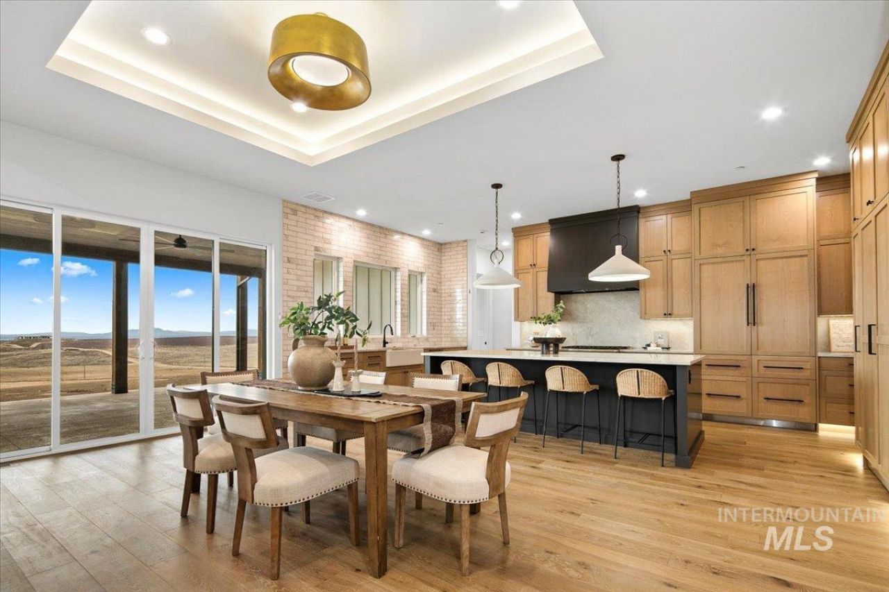 Must see lake views! Discover luxury country living on nearly 2 acres just south of Lake Lowell. This thoughtfully designed single-story home features 4 spacious bedrooms, 3.5 bathrooms, an office and large bonus room not included in bedroom count, and an impressive 52 RV bay in addition to the 3-car garage perfect for all your toys and storage needs. Enjoy elevated living with built-in Thermador appliances including built-in fridge, two dishwashers, hidden prep kitchen, and designer finishes throughout such as hard surface (quartzite) countertops, engineered hardwood floors and motion activated toe-kick and soffit lighting. 60 Indoor Heat & Glo Primo Fireplace, covered patio with cedar wood planks. Expansive windows frame scenic views of Lake Lowell, offering the peace of rural living just minutes from Nampas conveniences.