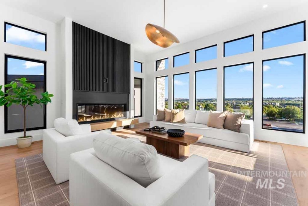 Striking modern architecture, brought to life by Teal Point Custom Homes. Set against the foothills with expansive valley views, every detail surpasses the standard of new construction. Inside, warm white oak flooring and smooth hand-plastered walls provide a sophisticated canvas for designer lighting & curated finishes. The showpiece kitchen is centered around a waterfall-edge marble island, complemented by two-toned cabinetry, stainless steel appliances, & paneled full-size refrigerator, freezer, & wine cooler. Retreat to the primary suite, where a spa-like bathroom awaits with dual vanities, a freestanding tub with a privacy wall, an oversized shower, & direct access to a private patio. True to Teal Points signature style, each bedroom includes its own en suite. Entertainment and work needs are met with a private home theater and a dedicated office. The sprawling outdoor covered living room is complete with a built-in kitchen for exceptional entertaining. Set in SE Boise just minutes from downtown Boise!